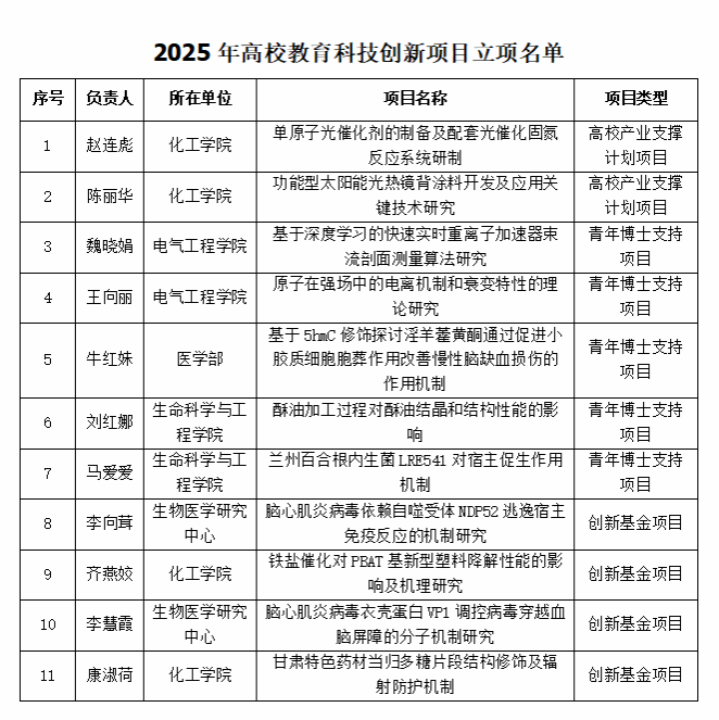 1219日,甘肃省教育厅公布2025年高校教育科技创新项目立项名单,学校获批高校教育科技创新项目11项,其中高校产业支撑计划项目2项,青年博士支持项目5项,创新基金项目4项。