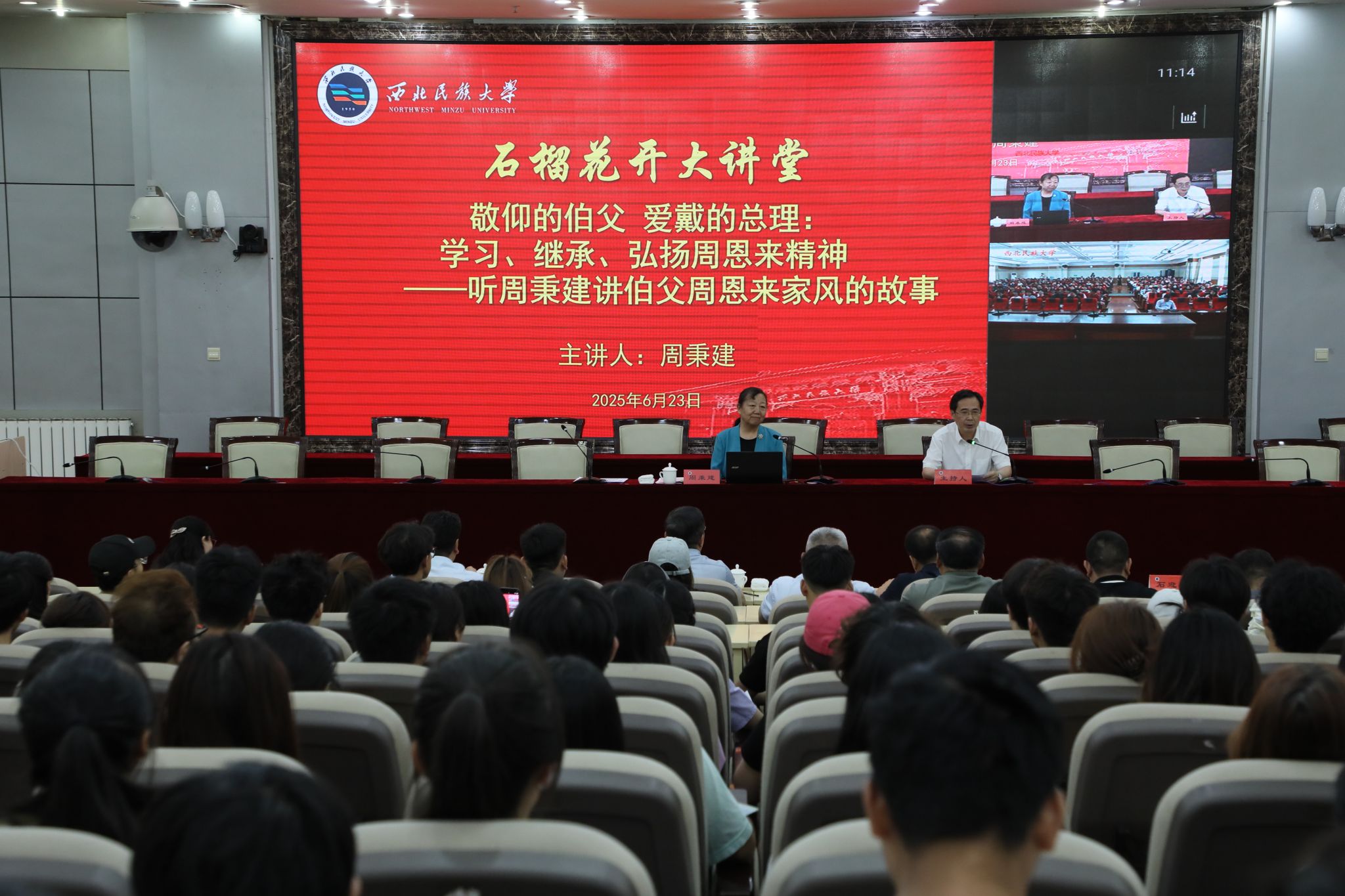 在全校上下开展深入贯彻中央八项规定精神学习教育之际,6月23日上午,学校邀请到全国政协第十一、十二、十三届委员,周恩来总理的侄女周秉建作客学校“石榴花开大讲堂”,以“敬仰的伯父 爱戴的总理:学习、继承、弘扬周恩来精神”为题作报告。党委副书记石迎春主持报告会。